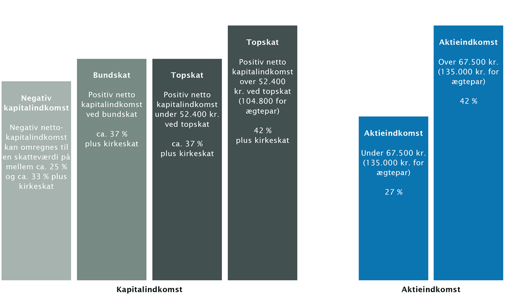 2026: Positiv nettokapitalindkomst under bundfradraget på 55.000 (110.000 kr. for ægtefæller) beskattes med ca. 37 pct. plus kirkeskat. Positiv nettokapitalindkomst over bundfradraget beskattes med indtil 42 pct. plus kirkeskat, der ligger mellem 0,4 og 1,3 pct. alt efter kommune. De ca. 37 pct. er summen af bundskat på 12,01 pct. og kommuneskat, som alt efter kommune er mellem 23,4 og 26,3 pct.