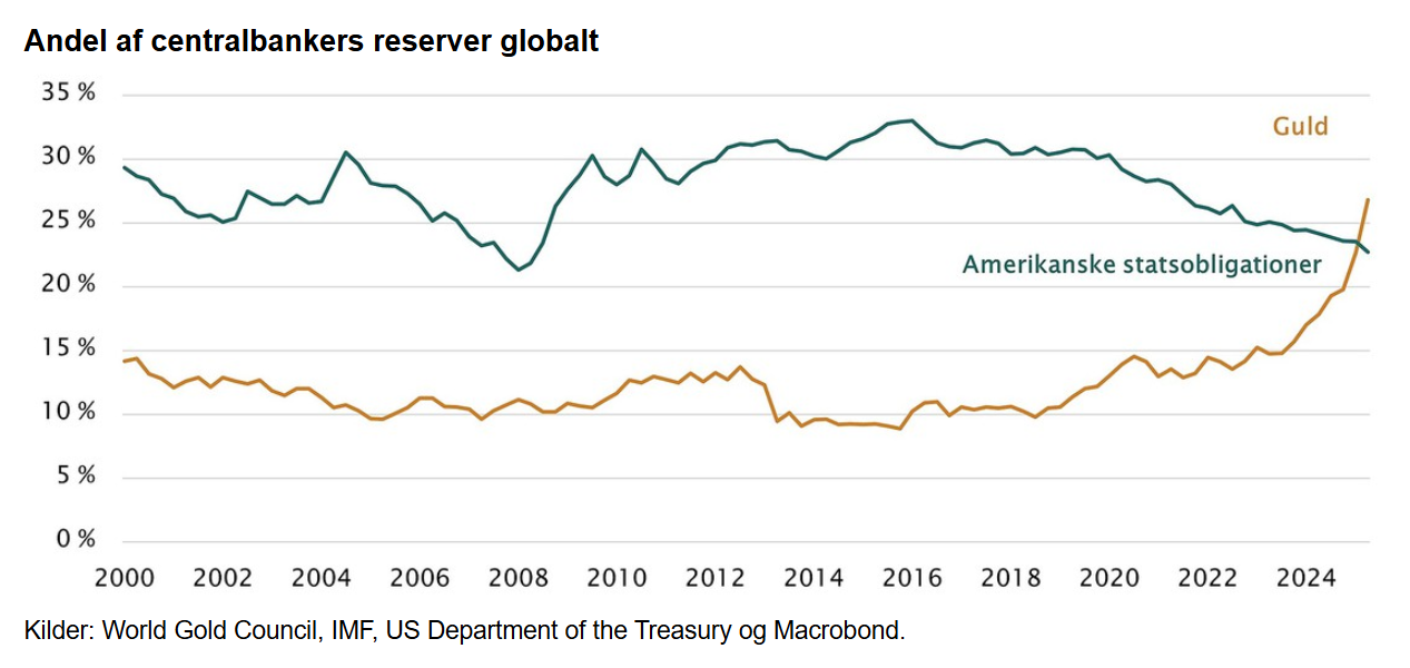 Med markedsuro, handelskrig og voksende geopolitiske spændinger søger både investorer og centralbanker mod guld. Amerikanske statsobligationer vakler som sikker havn, og der er udsigt til endnu højere statsgæld - både i USA og globalt.
