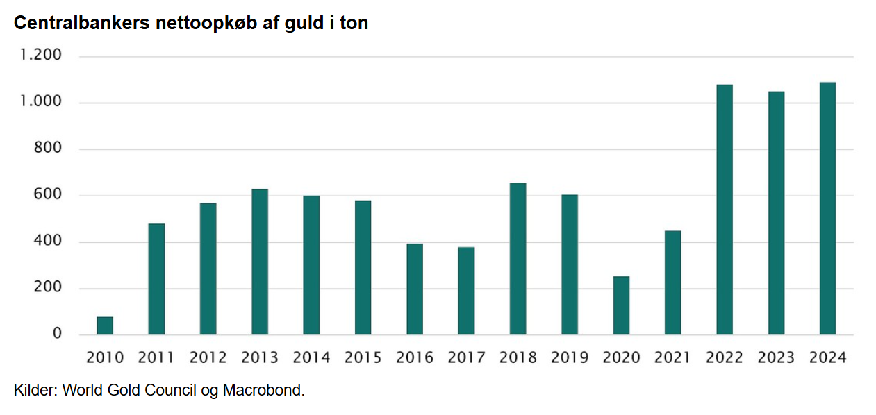På trods af prisstigningerne er guldopkøbene taget til de seneste tre år. Centralbankerne har øget deres beholdninger af guld med over 1.000 ton årligt.