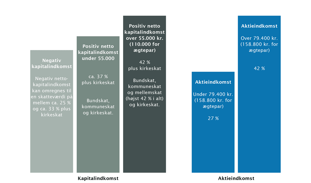 2026: Positiv nettokapitalindkomst under bundfradraget på 55.000 (110.000 kr. for ægtefæller) beskattes med ca. 37 pct. plus kirkeskat. Positiv nettokapitalindkomst over bundfradraget beskattes med indtil 42 pct. plus kirkeskat, der ligger mellem 0,4 og 1,3 pct. alt efter kommune. De ca. 37 pct. er summen af bundskat på 12,01 pct. og kommuneskat, som alt efter kommune er mellem 23,4 og 26,3 pct.