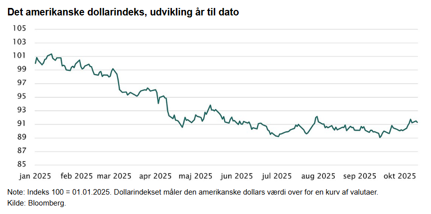 Dollaren er i gennemsnit svækket med omkring 9 pct. over for en bred gruppe valutaer, hvilket er usædvanligt, da dollaren normalt styrkes i perioder med global uro.