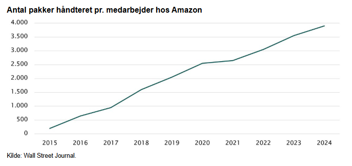 Amazon håndterer nu 3.870 pakker pr. ansat årligt mod blot 175 pr. ansat i 2015.