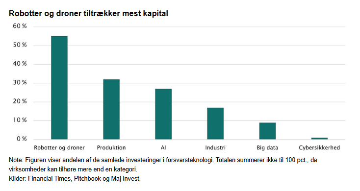 Bag de samlede tal gemmer der sig store forskelle i, hvilke områder der tiltrækker kapitalen. Robotter og droner står for langt størstedelen, mens produktion og AI også er på vej frem. Til gengæld halter cybersikkerhed og big data efter.
