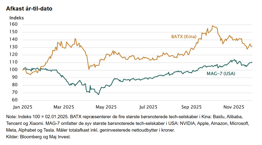 Kinesiske tech-virksomheder puster de amerikanske i nakken. Kinesiske tech-aktier har outperformet de amerikanske i år, når man måler i samme valuta.
