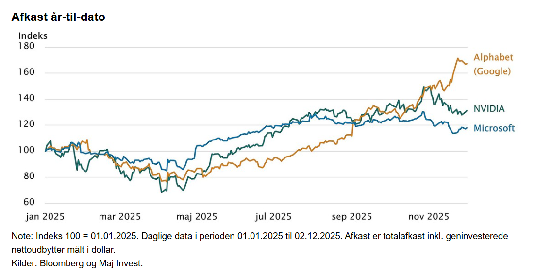 Og Google viser fremskridt ved at investere i hele værdikæden - fra egne mikrochips til egen AI-software. Derfor har Alphabet, Googles moderselskab, trukket fra på aktiemarkedet i år.